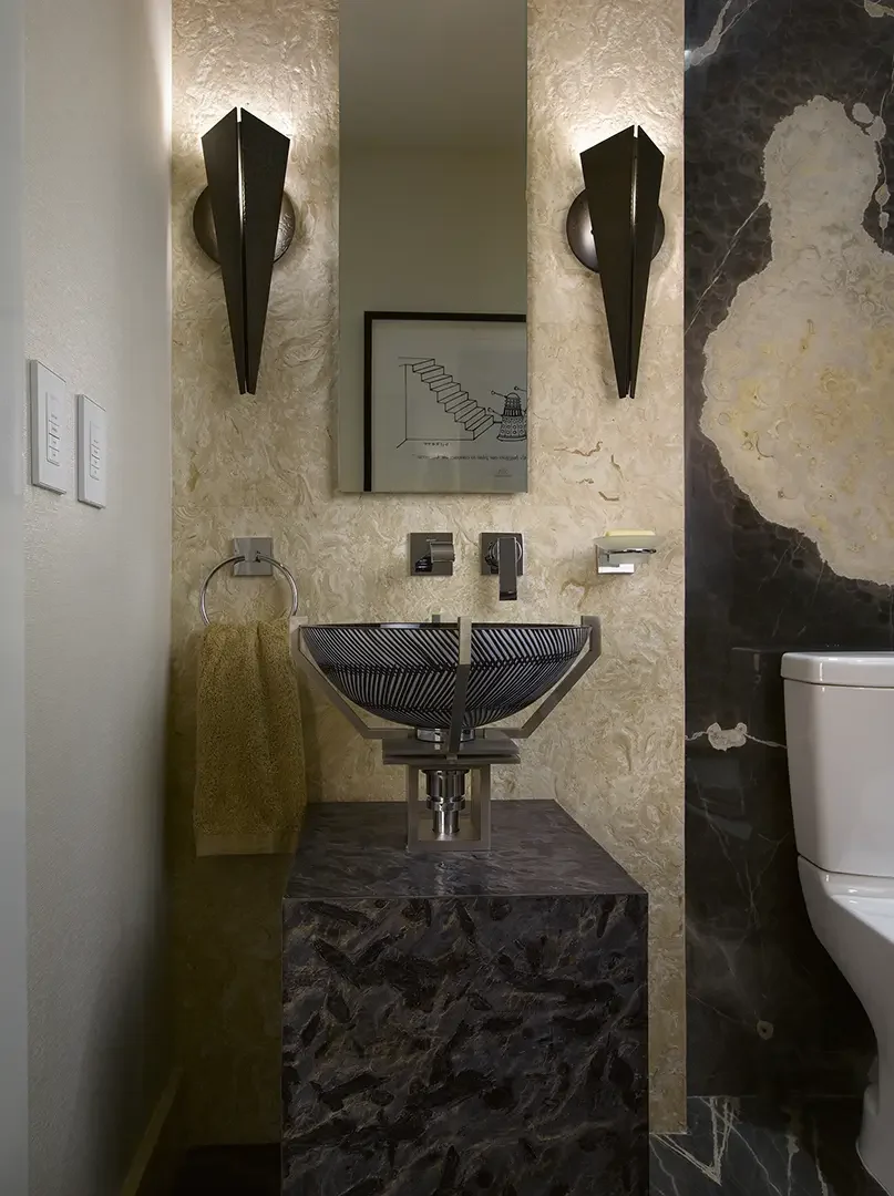 To create an open yet defined space, our firm reconfigured this 2,200-sq.-ft. condo for empty nesters and art lovers, using ceiling details and a 30’ backlit quartzite wall to guide flow. Gray textures and Ipe floors set the stage for ocean views and bold art. A custom sink modeled after the owner’s engagement ring adds personal flair, while sculptural elements throughout offer elegance, function, and meaning.