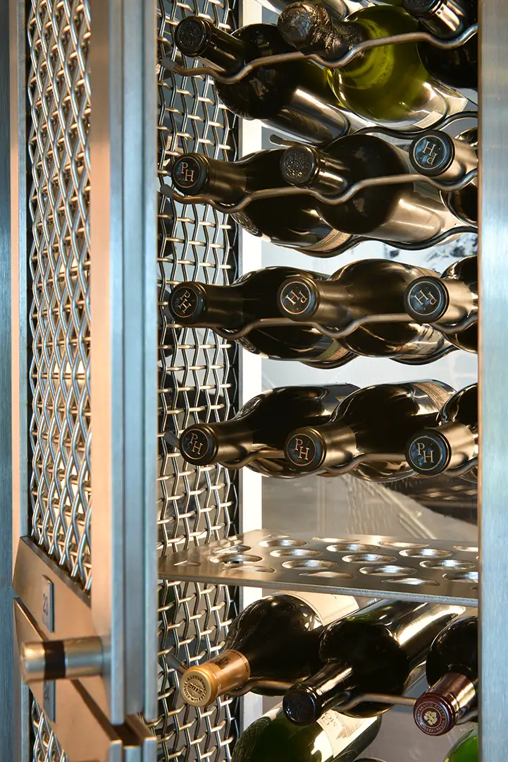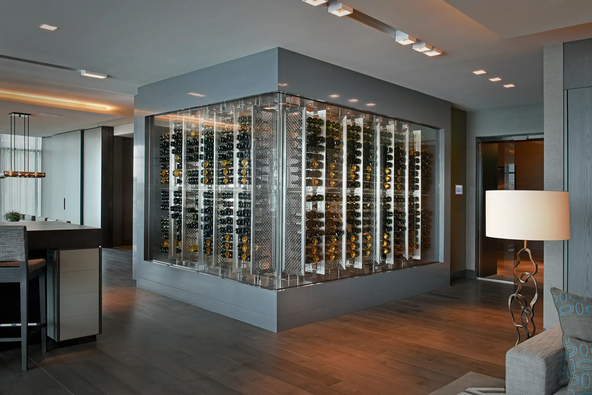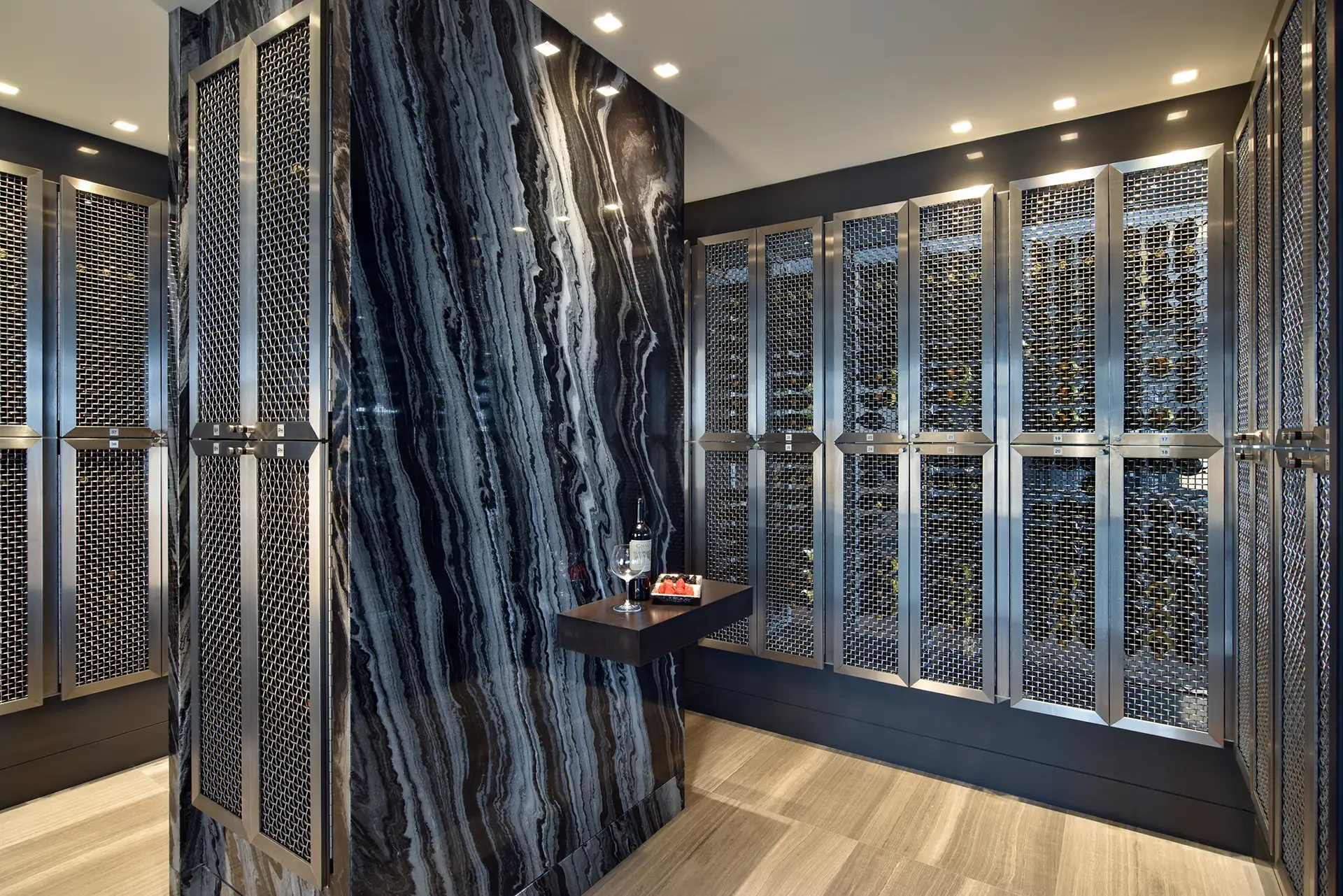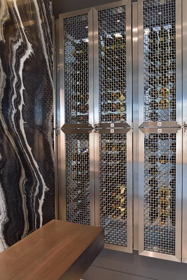 Our firm crafted the Regalia Residences wine cellar as both a functional showcase and a statement piece within the home. Enclosed in frameless glass and wrapped in custom stone, the design creates a dramatic focal point while allowing an uninterrupted view of the vintages within. Integrated climate control ensures optimal preservation, while precision lighting highlights each bottle, transforming the collection into an art display. Thoughtfully positioned alongside the residence’s bar and dining spaces, the wine cellar becomes a natural centerpiece for entertaining, seamlessly blending refined aesthetics with exceptional performance.